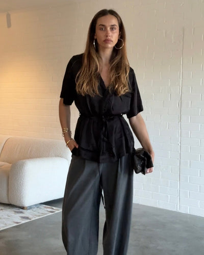 The Elsie Shirt is crafted from 100% viscose with a silky finish - a natural fibre derived from wood, chosen for its soft drape and gentle feel. Designed with a relaxed short sleeve, open collar, and soft V-neckline, it’s finished with a tie belt to define the waist and move easily from day to night.
